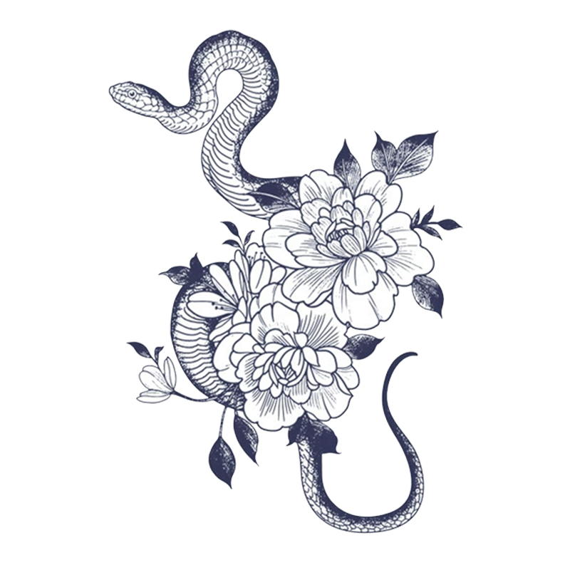 A striking temporary tattoo that beautifully intertwines a mysterious serpent with blooming flowers. This bold yet elegant design combines the allure of danger with natural beauty, creating a perfect balance between wild and delicate elements.
