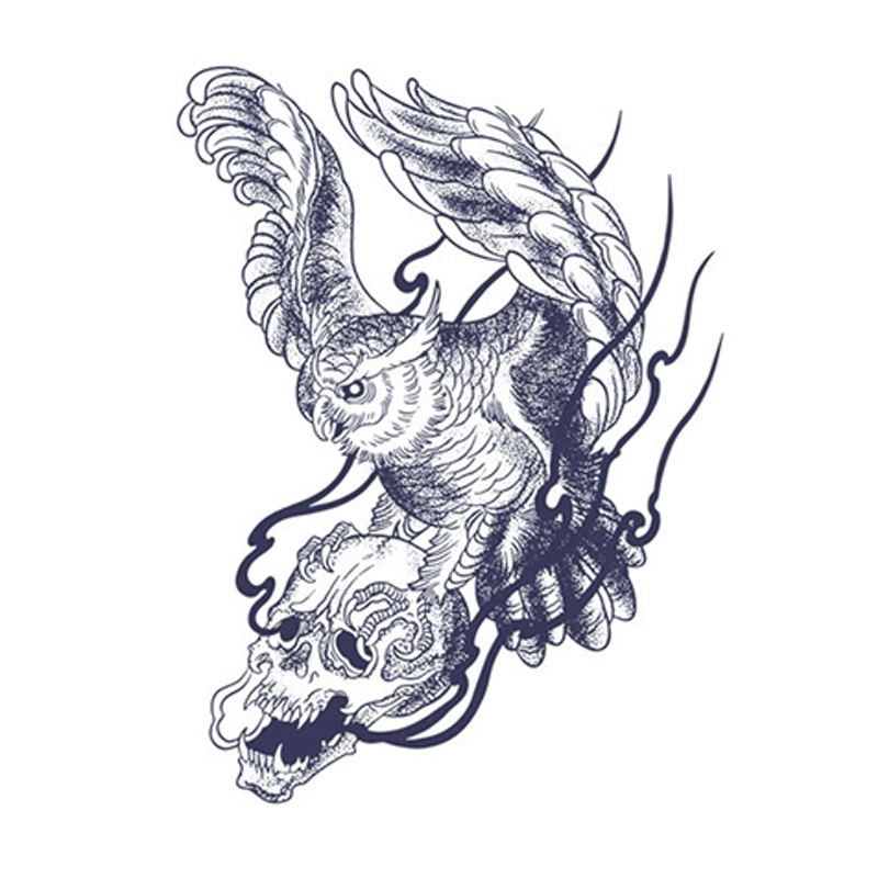 A striking temporary tattoo featuring a powerful owl clutching a mysterious skull. This bold design merges the wisdom of the night's hunter with dark artistry, creating an edgy statement piece that commands attention.
